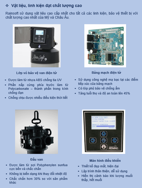 Máy lọc nước Rainsoft là dòng sản phẩm tiên tiến nhất thế giới hiện nay được sản xuất tại Mỹ, các sản phẩm tối tân của Rainsoft đều được giám sát và vận hành hoàn toàn tự động bằng điện tử. Tự động tính toán lưu lượng, thời gian sục rửa và hoàn nguyên các vật liệu, nhằm tiết kiệm năng lượng và muối tái sinh.